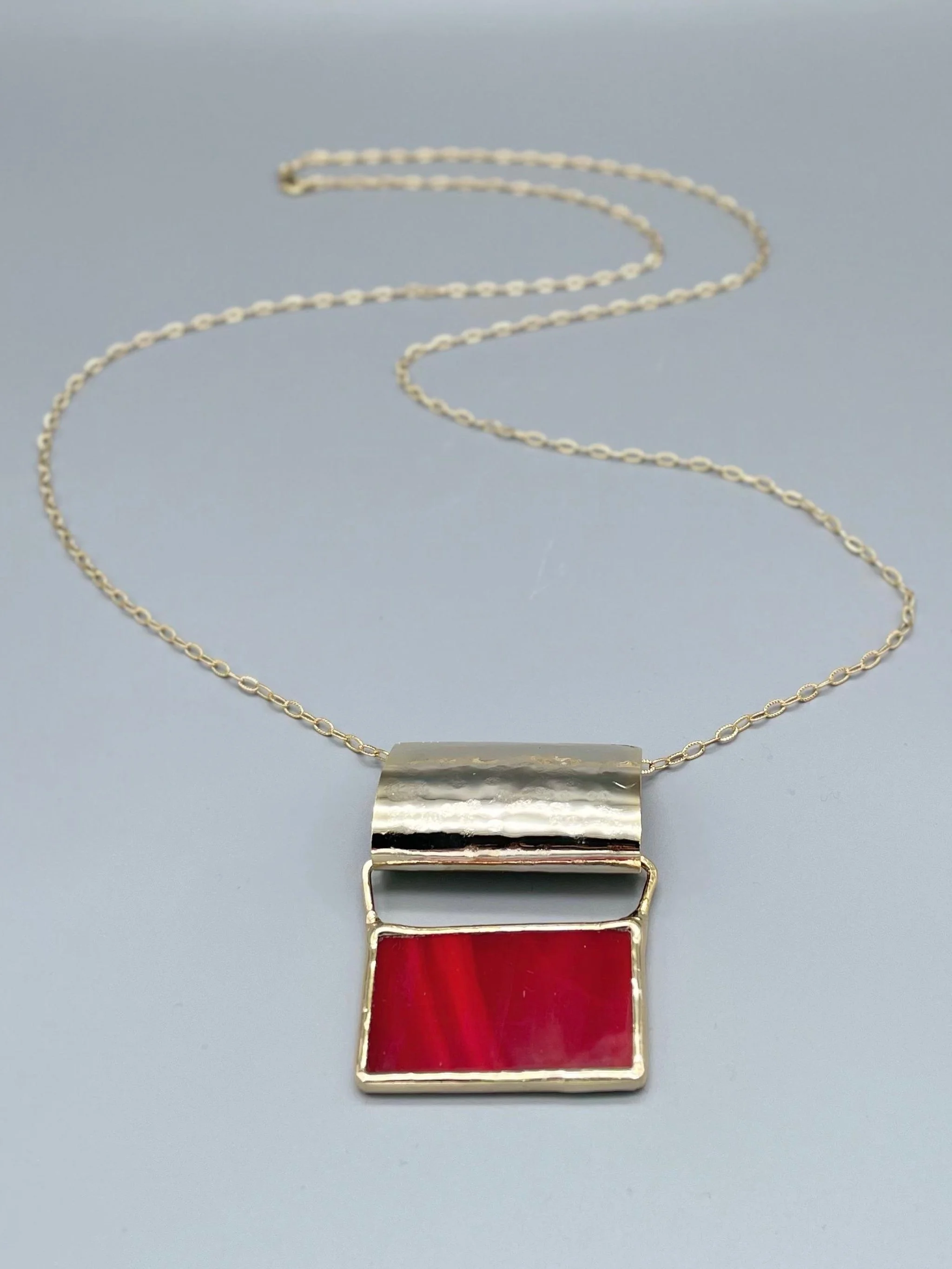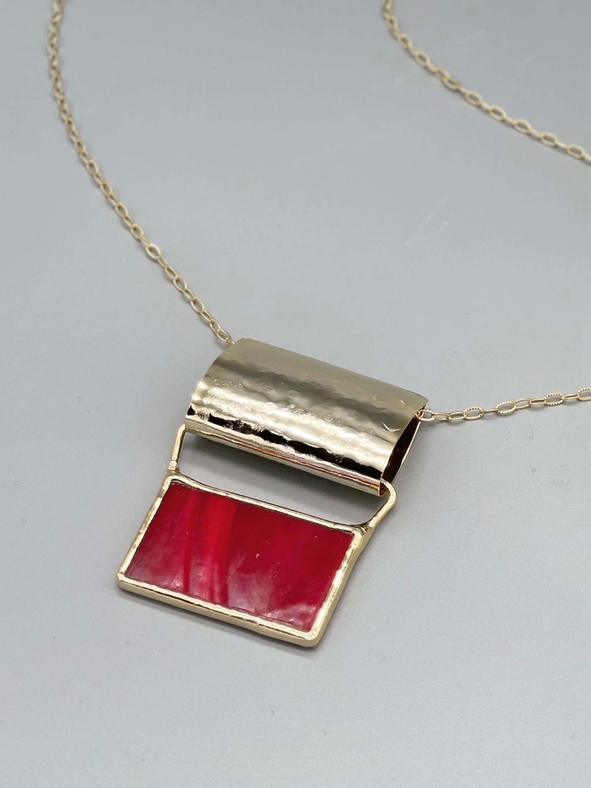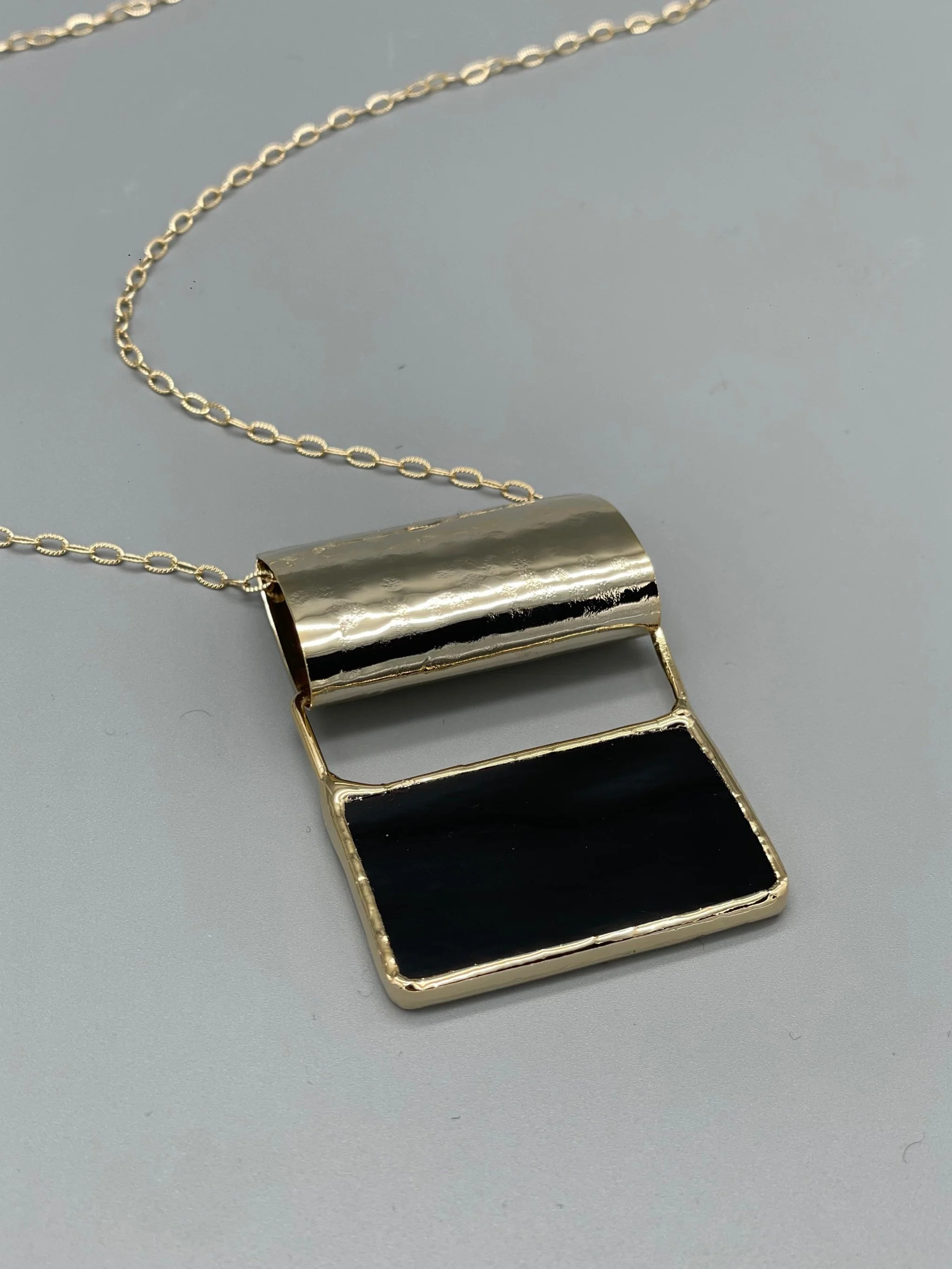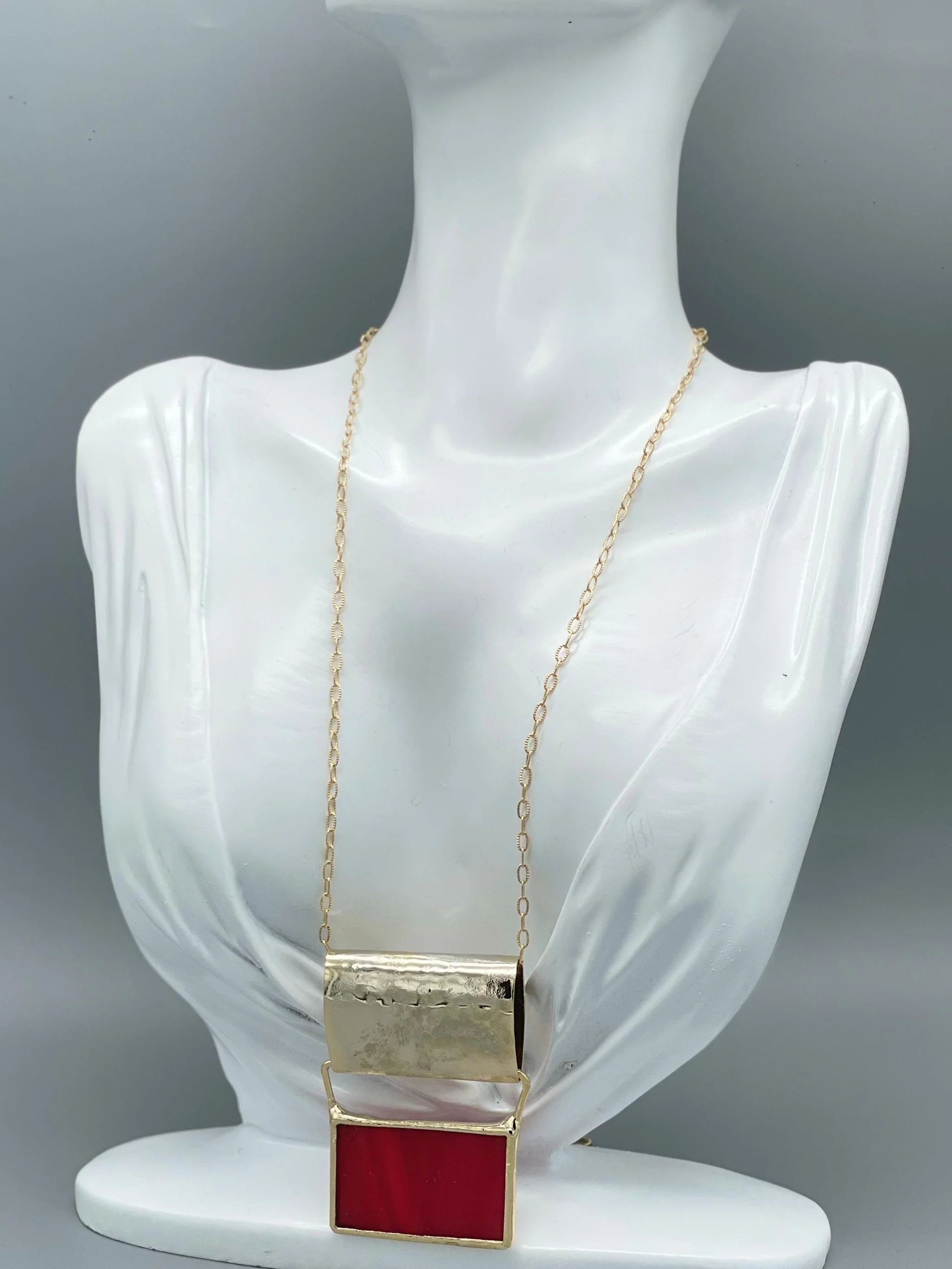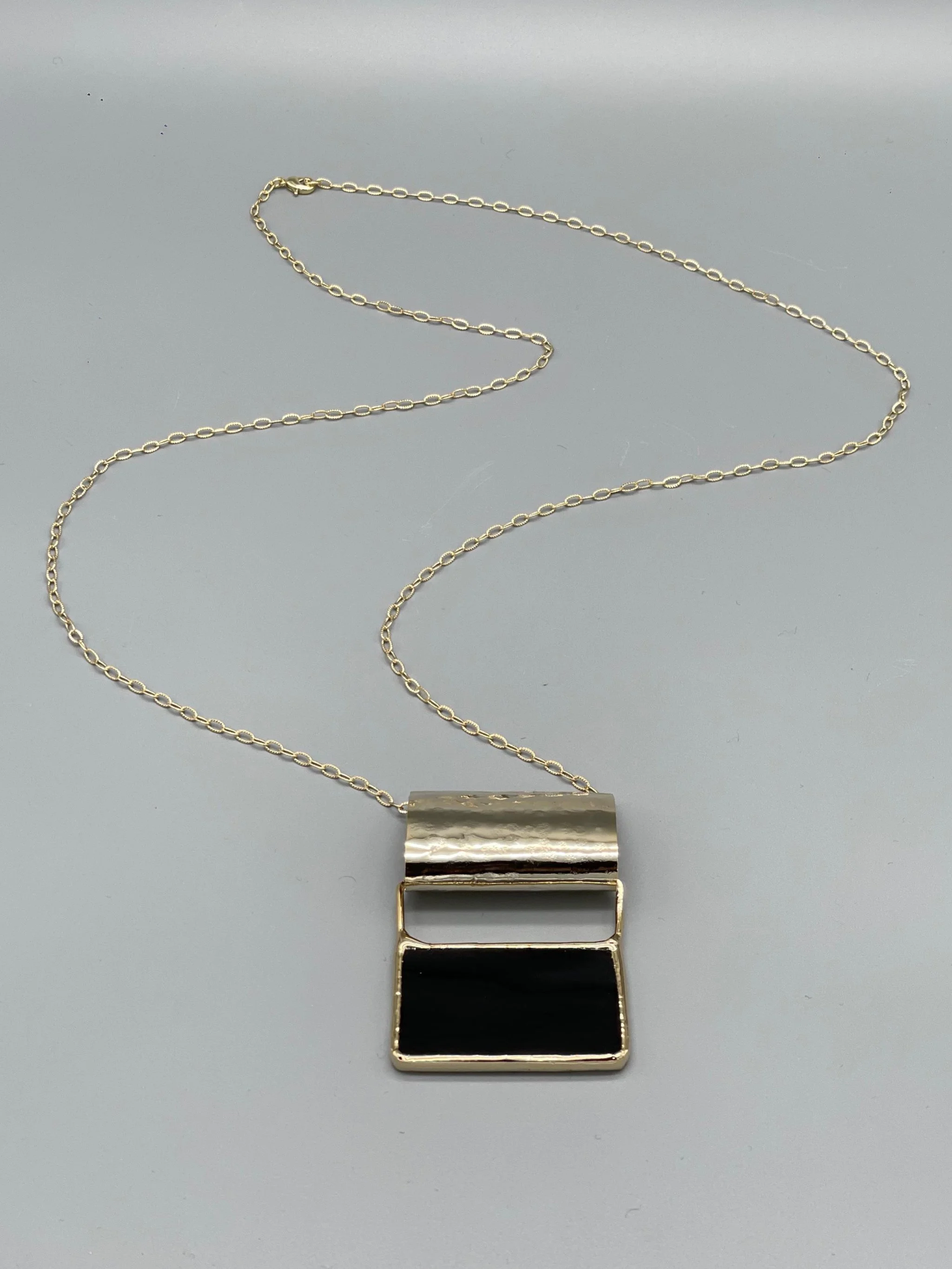 Una collana dal carattere grafico e contemporaneo, dove il vetro prezioso verde incontra l’ottone dorato in una geometria essenziale.